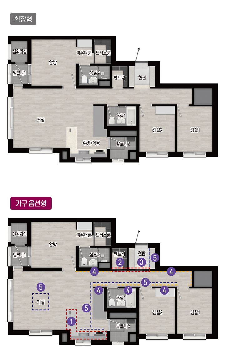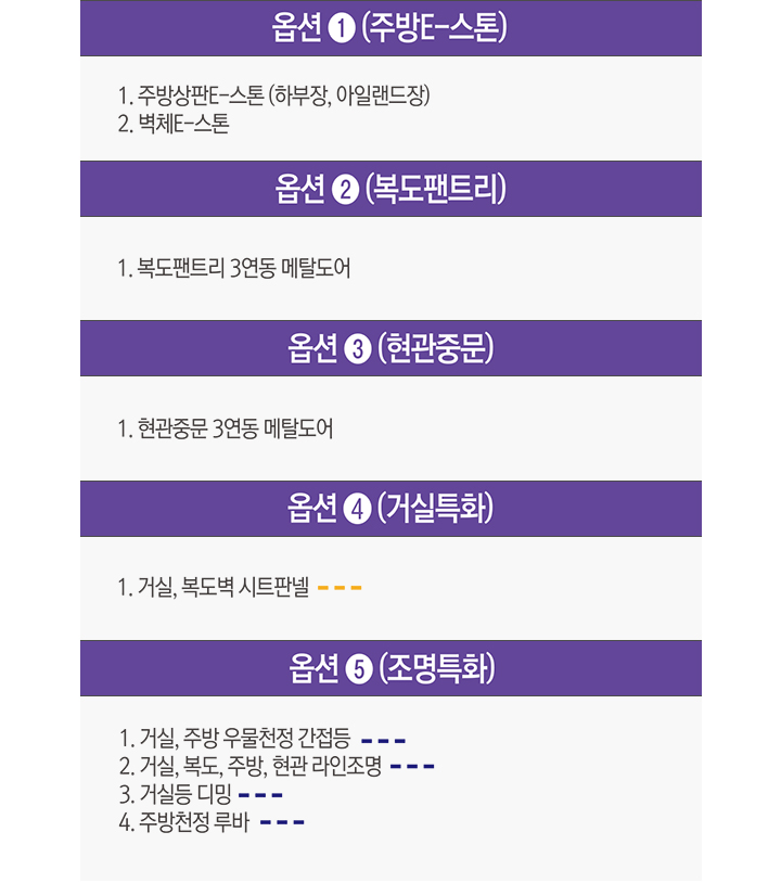 ※ 상기 이미지의 옵션은 가구형 유상옵션만 표기되어 있으니 가전 유상옵션 및 기타 유상옵션은 주택전시관에서 확인하시기 바랍니다.